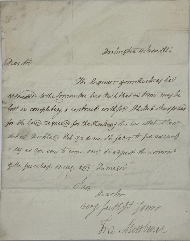 One page letter from committee of Stockton to Darlington Railway regarding land purchase at St Helen's Auckland with draft reply dated Darlington 4 June 1822. ... [More]
