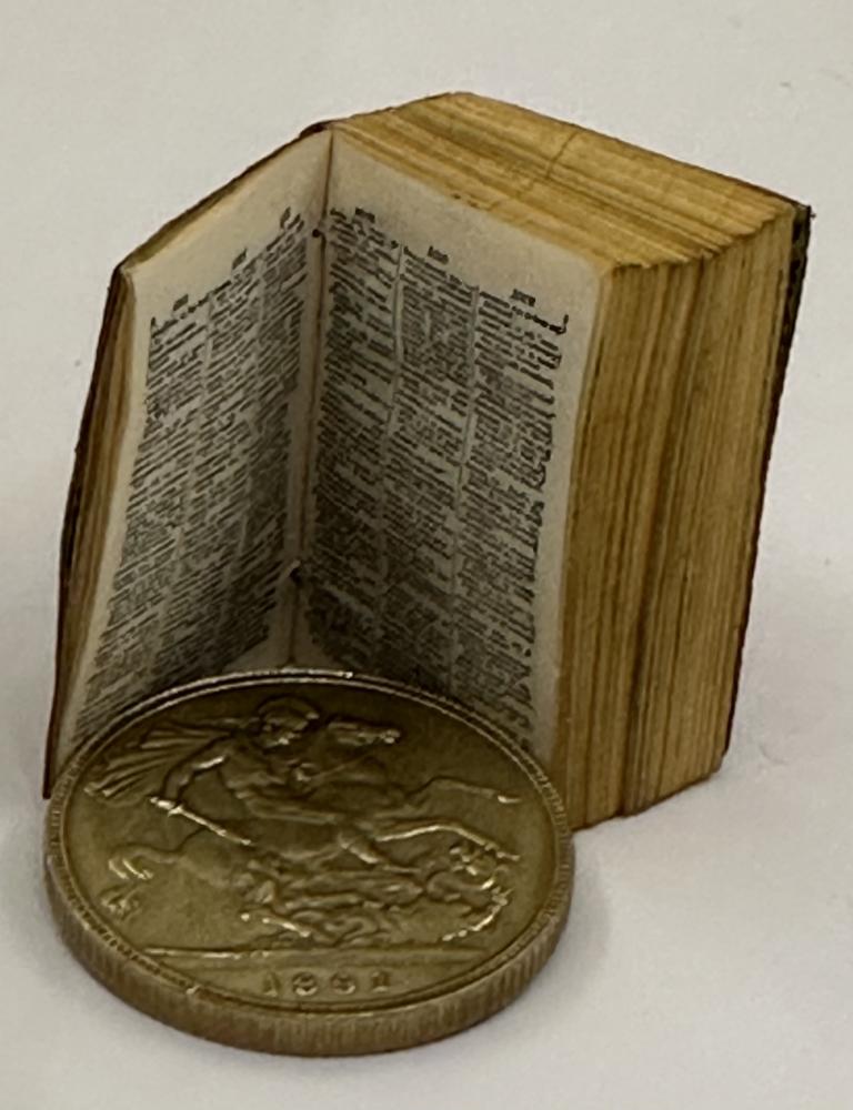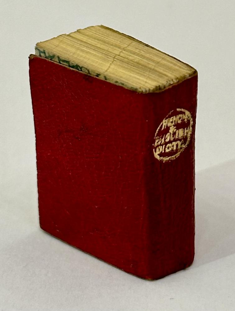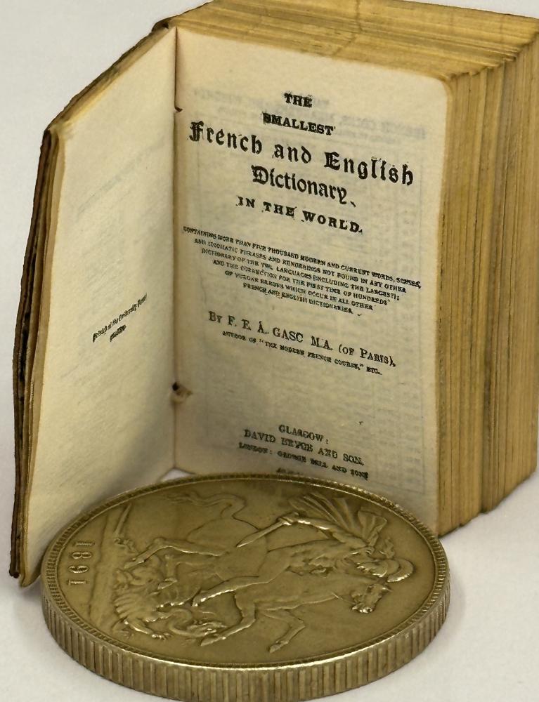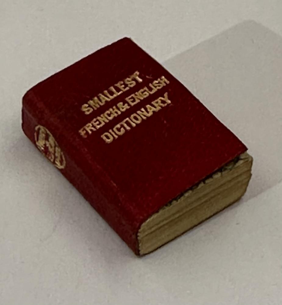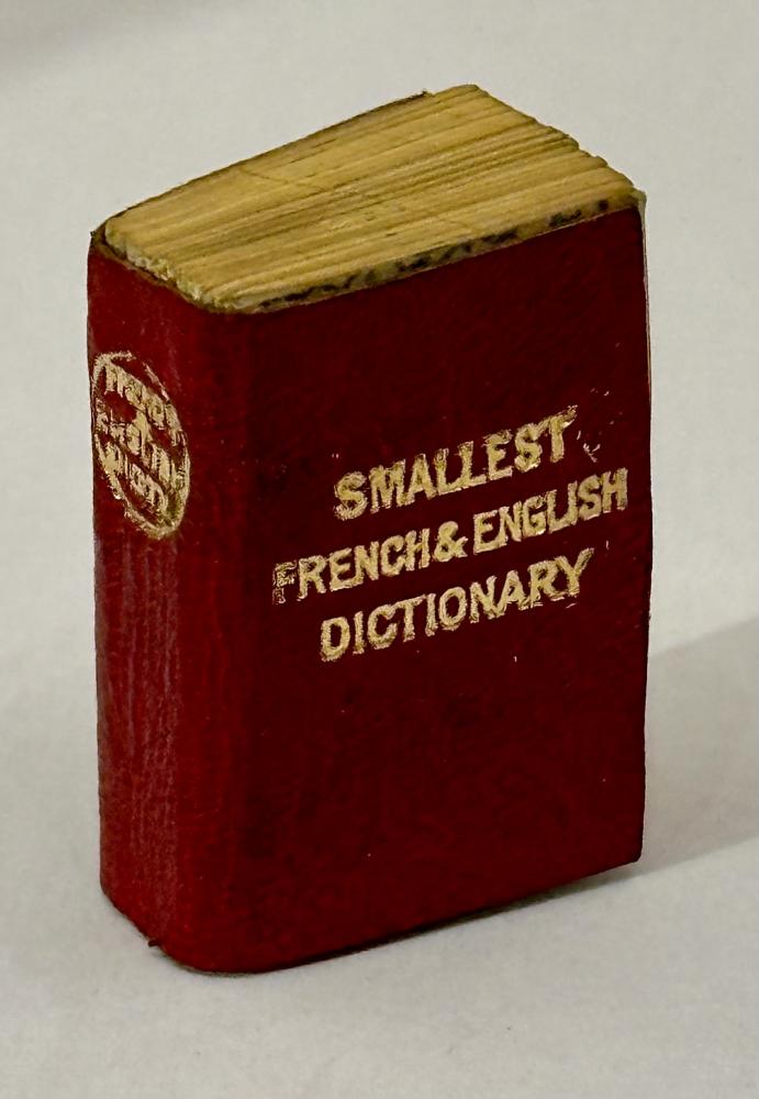 CGS0114 ![]() Click image to enlarge ![]() ![]() ![]() ![]() ![]() ![]() ![]() Smallest French and English Dictionary in the World, Published by David Bryce & Sons, Glasgow, edited by F E A Gasc DESCRIPTION: (6) 648 Pages, patterned endpapers at front and back, printed on fine india paper. Main dictionary text appears in three columns, bound in publisher's red leather with 'Smallest French & English Dictionary' on front cover. Bryce metal locket with magnifying glass present. SIZE: 21 x 28mm CONDITION: Miniature: Ownership name on front endpaper, Very minor bowing however overall a very good example. £165.00 Have a Question?You need to be Signed In to ask questions. |