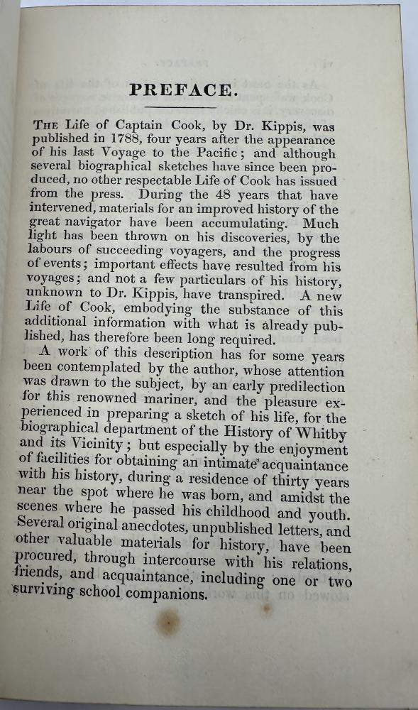 CGS0157 ![]() Click image to enlarge ![]() ![]() ![]() ![]() ![]() ![]() ![]() ![]() ![]() The life and voyages of Captain James Cook : drawn up from his Journals, and other authentic documents and comprising much original information by the Rev. George Young. DESCRIPTION: London, Whittaker, Treacher and co, 1836. xii, 472 p., [6] leaves of plates : ill. . 8vo, pp xii, 466, with a frontispiece portrait of Cook, 6 full page wood-engraved plates, one text wood-engraving, in a fine prize binding [London City School] of contemporary full tan polished calf, spine gilt ruled with raised bands and black label, minor rubbing and light offsetting of frontispiece onto the frontispiece, else a fine clean copy, FIRST EDITION; dedicated to King William IV, this notable life of Cook was printed for George Young in Whitby, where he was a minister at Cliff Lane Chapel; he was a noted Whitby author and local historian, Whitby being the place Cook had started his maritime career as a local fishing apprentice before joining the Royal Navy. His local connections allowed the Rev Young to access and publish a number of Cook's early letters for a first time. SIZE: 165 x 104mm CONDITION: minor rubbing and light offsetting of frontispiece onto the frontispiece, else a fine clean copy. Overall an excellent copy of a scarce and significant work. £325.00 Have a Question?You need to be Signed In to ask questions. |
