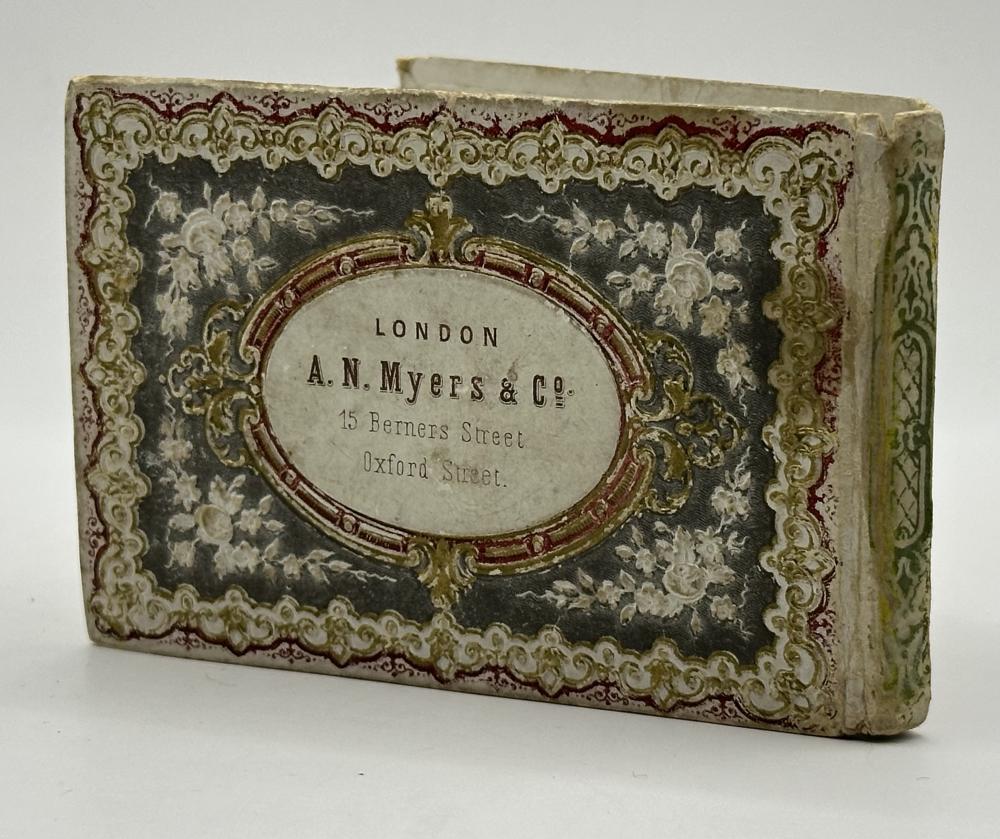 WPLJ0202 ![]() Click image to enlarge ![]() ![]() ![]() ![]() ![]() ![]() ![]() ![]() ![]() ![]() Dolly's Picture Book with Twelve Original Coloured Designs... Translated from the German by Madame de Chatelain. Third Edition. Stuttgart, Theinemann's / London, A N Myers by Rudolph Geissler, translated by Madam de Chatelain, Circa 1870, DESCRIPTION: with letterpress title page and 12 hand-coloured plates including a second pictorial title page, the other 11 plates with letterpress title and verse description on separate page facing, original embossed gold on white paper boards with sellers name of A N Myers on lower board, edges gilt, THIRD EDITION; the German origins of this doll or doll's house book are evident from the presentation and imprint, and although not by definition a miniature book a copy of the fourth edition was including in the 2006 Christie's sale of miniatures from the collection of Nigel Temple. SIZE: Size 60 x 85 mm or 3.3 x 2.3 inches CONDITION: Boards slightly soiled including a faint stain to right side of upper board otherwise a very good clean copy. £395.00 Have a Question?You need to be Signed In to ask questions. |