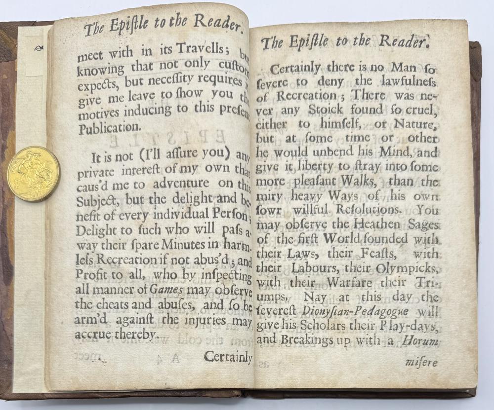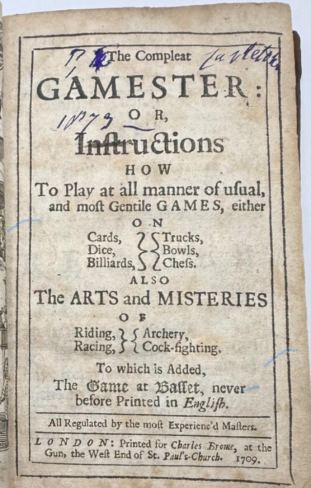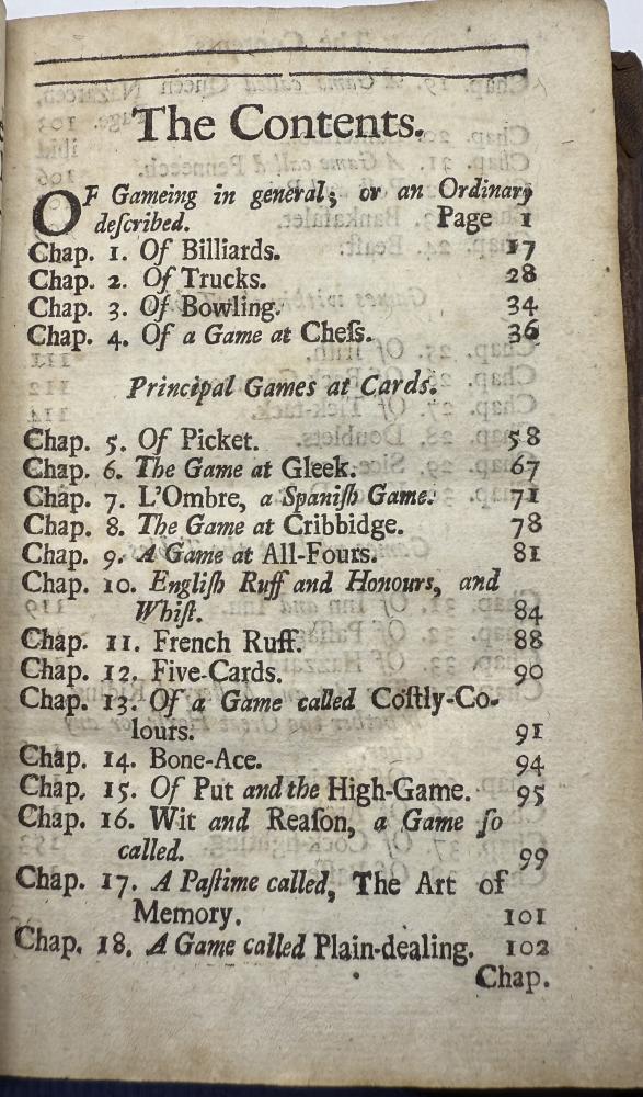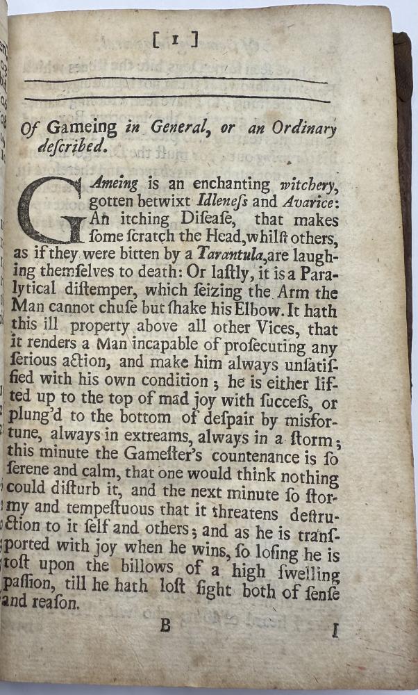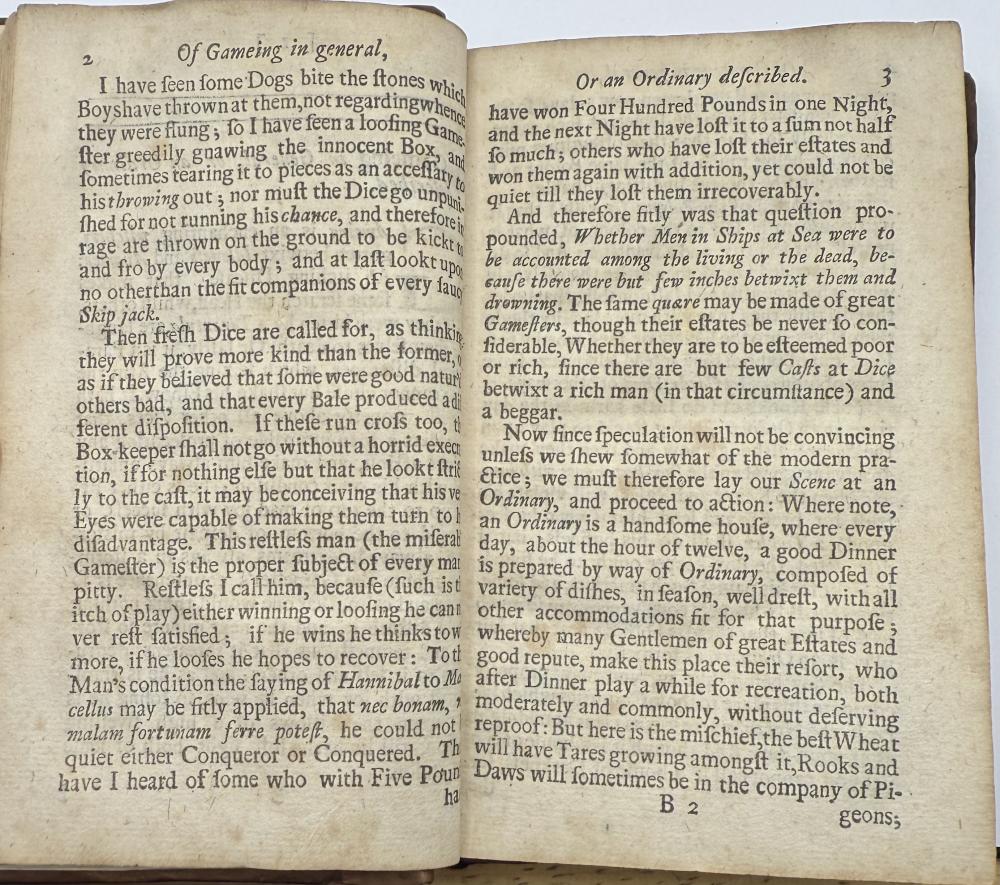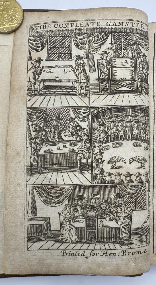 | COTTON, Charles -The Compleat Gamester - Cards - Billiards - Chess - London 1709 CGS0213  Click image to enlarge   .jpeg) .jpeg) .jpeg) .jpeg) .jpeg) .jpeg) .jpeg) .jpeg) .jpeg) .jpeg) .jpeg) .jpeg) .jpeg) .jpeg) .jpeg) .jpeg) The Compleat Gamester: or, instructions how to play at all manner of usual and most gentile games, either on cards, dice, billiards, trucks, bowls, chess. Also the arts and misteries of riding, racing, archery, cock-fighting. To which is added, the game of basset, never before Printed in English. All Regulated by the most Experienc'd Masters by Charles Cotton. DESCRIPTION: London 1709, printed for Charles Browne, at the Gun, the West End of St. Paul's-Church, 1709. Small octavo, pagination: [16], 184, with an engraved frontispiece depicting a variety of table and communal games, and with a leaf of poetical explanation bound before it [this slightly trimmed at foot, but legible], bound in contemporary ruled sheep sometime neatly rebacked in calf with red label.  SIZE: TBC CONDITION: Lacking one leaf of text [B8], pages 15/16, from Cotton's original 1674 preface quoting an earlier poem on the subject of gaming else complete to all the gaming instructions;  £625.00 Have a Question?You need to be Signed In to ask questions. |