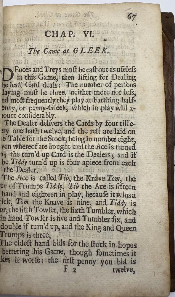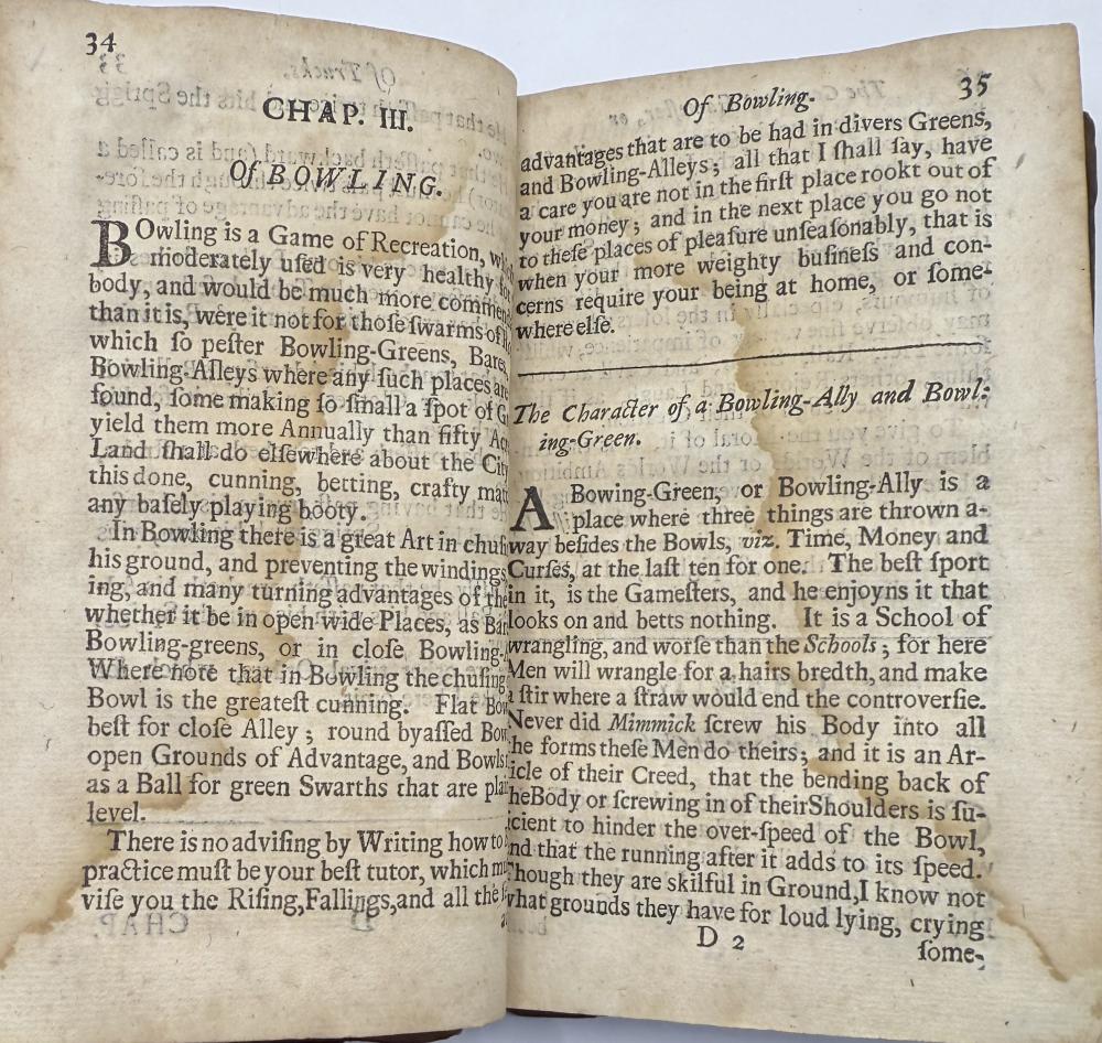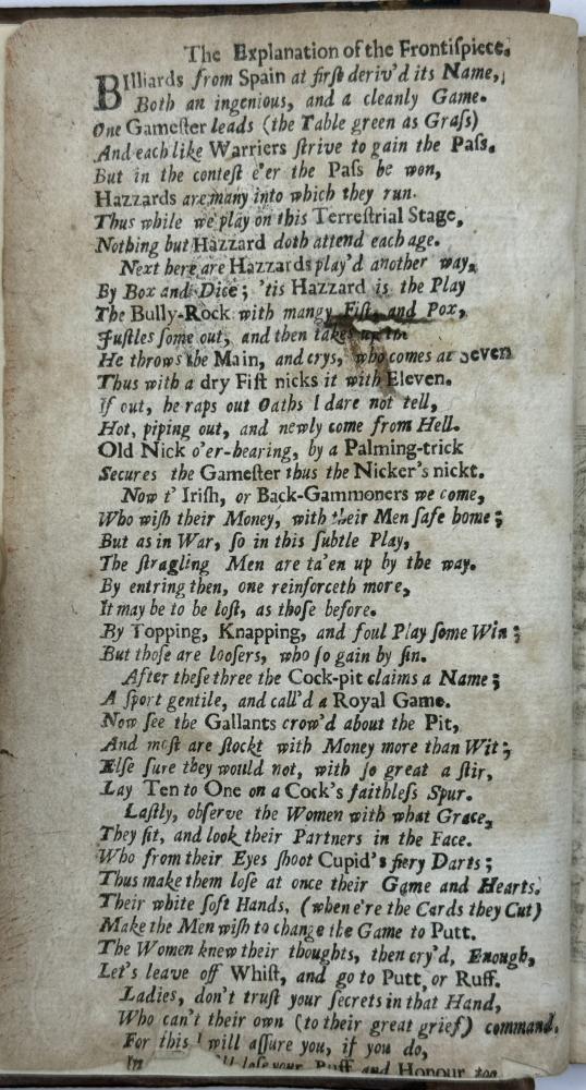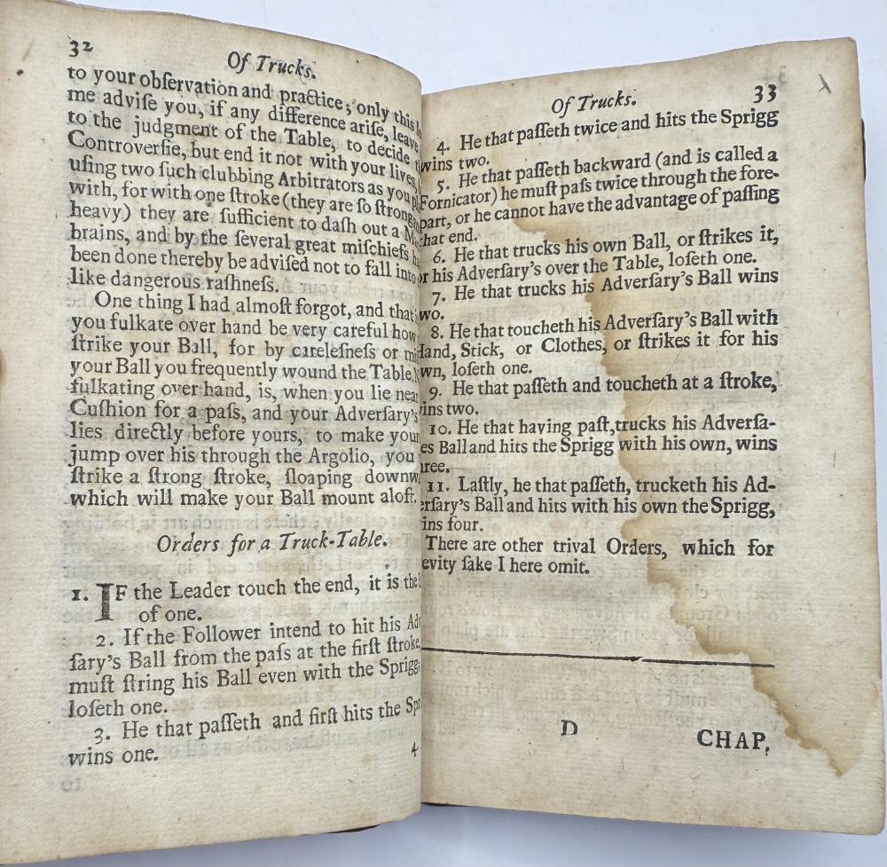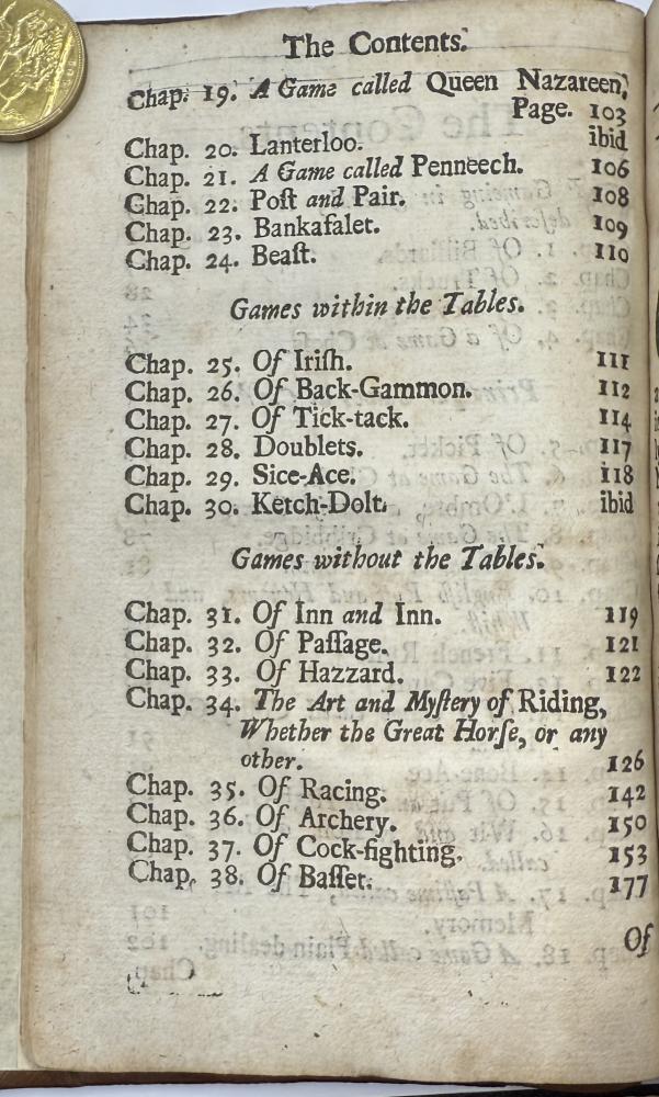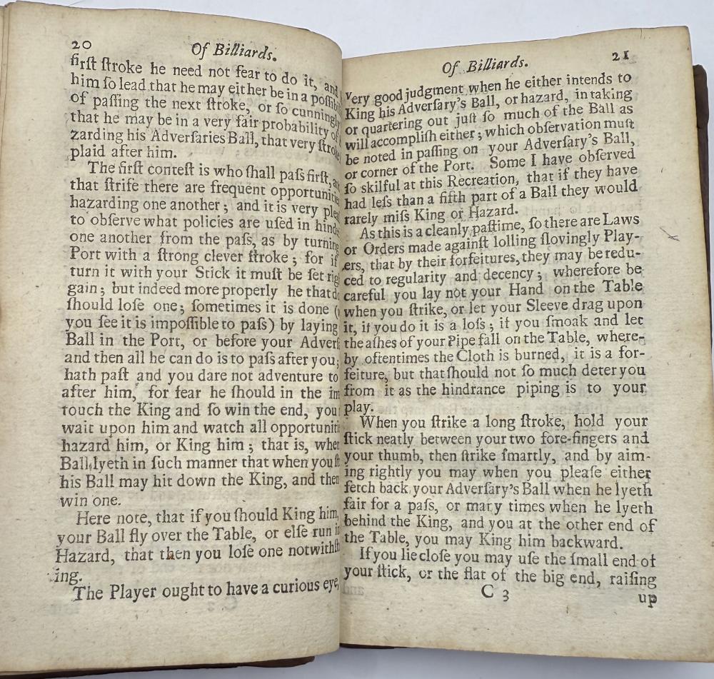 | COTTON, Charles -The Compleat Gamester - Cards - Billiards - Chess - London 1709 CGS0213  Click image to enlarge   .jpeg) .jpeg) .jpeg) .jpeg) .jpeg) .jpeg) .jpeg) .jpeg) .jpeg) .jpeg) .jpeg) .jpeg) .jpeg) .jpeg) .jpeg) .jpeg) The Compleat Gamester: or, instructions how to play at all manner of usual and most gentile games, either on cards, dice, billiards, trucks, bowls, chess. Also the arts and misteries of riding, racing, archery, cock-fighting. To which is added, the game of basset, never before Printed in English. All Regulated by the most Experienc'd Masters by Charles Cotton. DESCRIPTION: London 1709, printed for Charles Browne, at the Gun, the West End of St. Paul's-Church, 1709. Small octavo, pagination: [16], 184, with an engraved frontispiece depicting a variety of table and communal games, and with a leaf of poetical explanation bound before it [this slightly trimmed at foot, but legible], bound in contemporary ruled sheep sometime neatly rebacked in calf with red label.  SIZE: TBC CONDITION: Lacking one leaf of text [B8], pages 15/16, from Cotton's original 1674 preface quoting an earlier poem on the subject of gaming else complete to all the gaming instructions;  £625.00 Have a Question?You need to be Signed In to ask questions. |