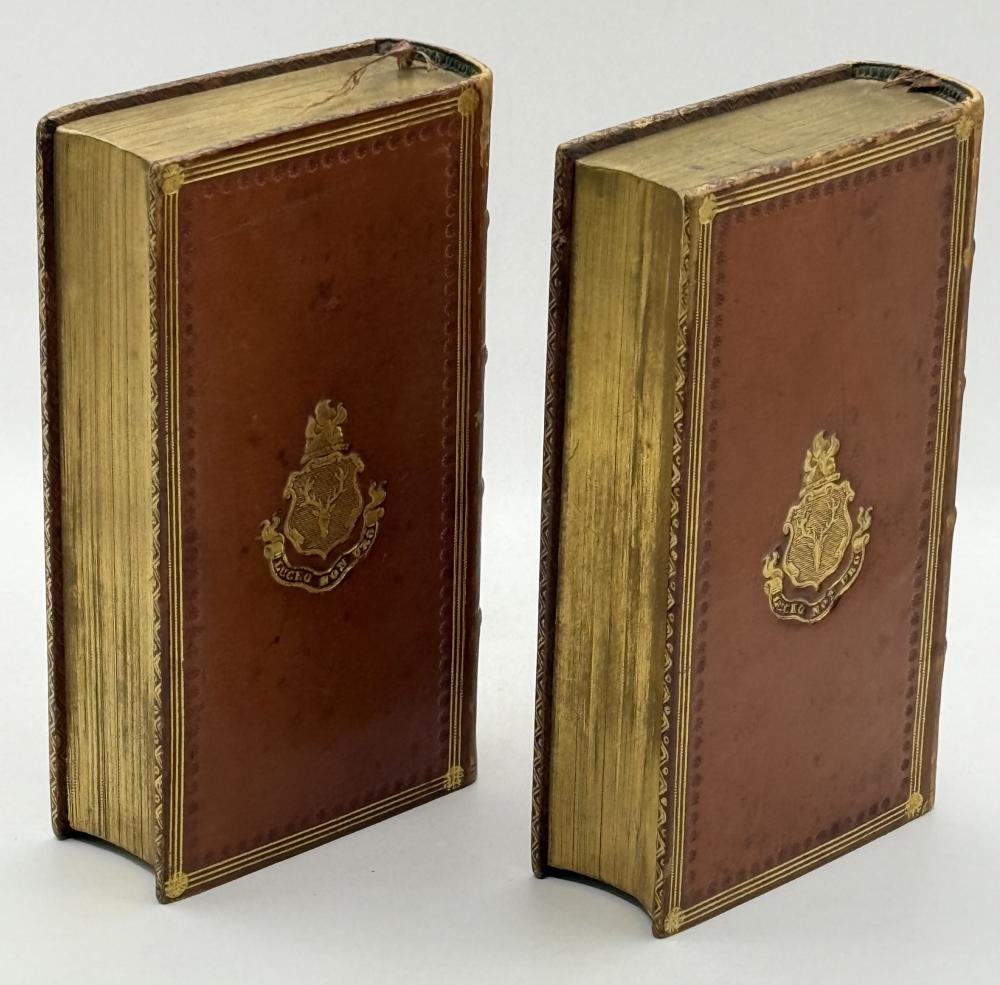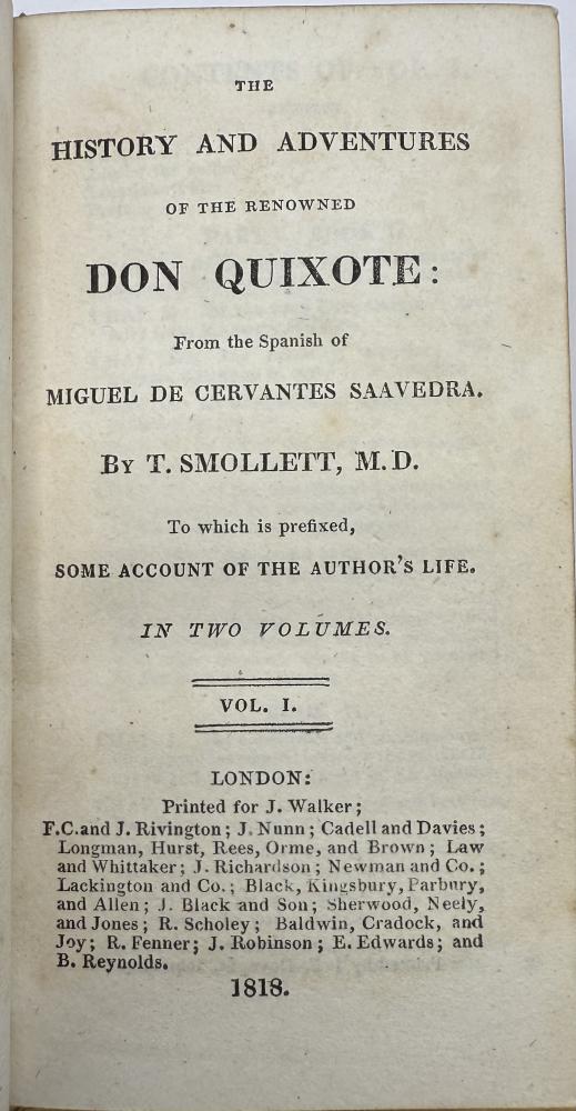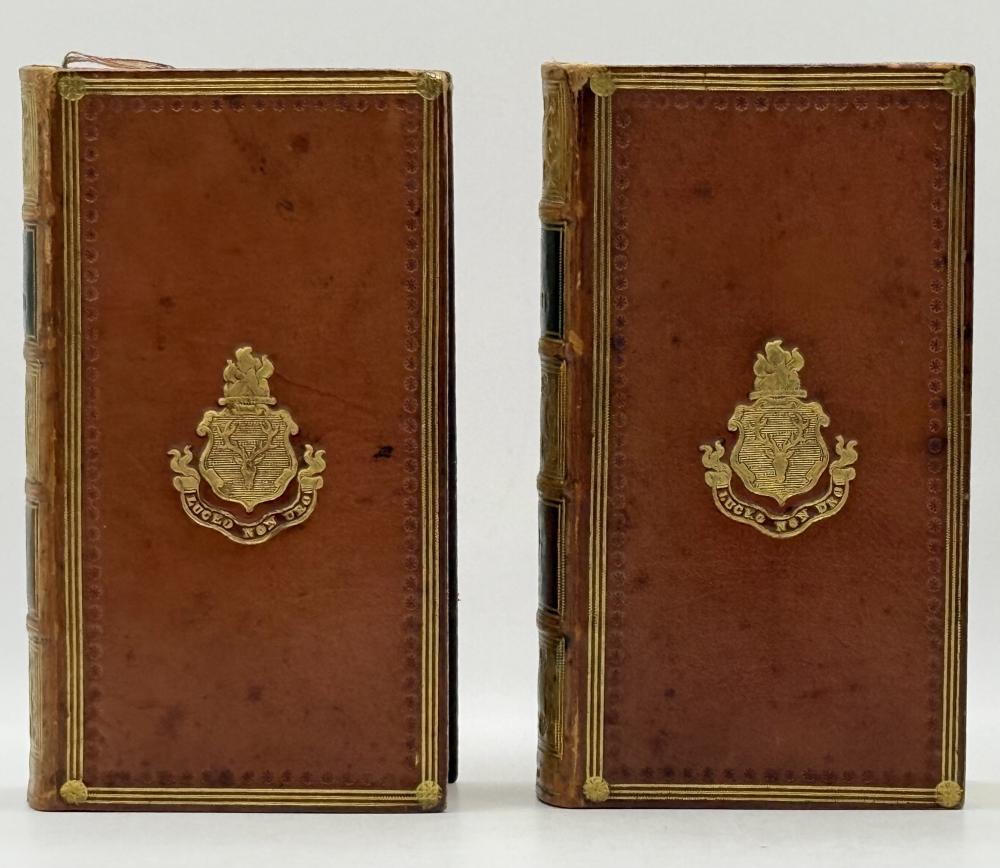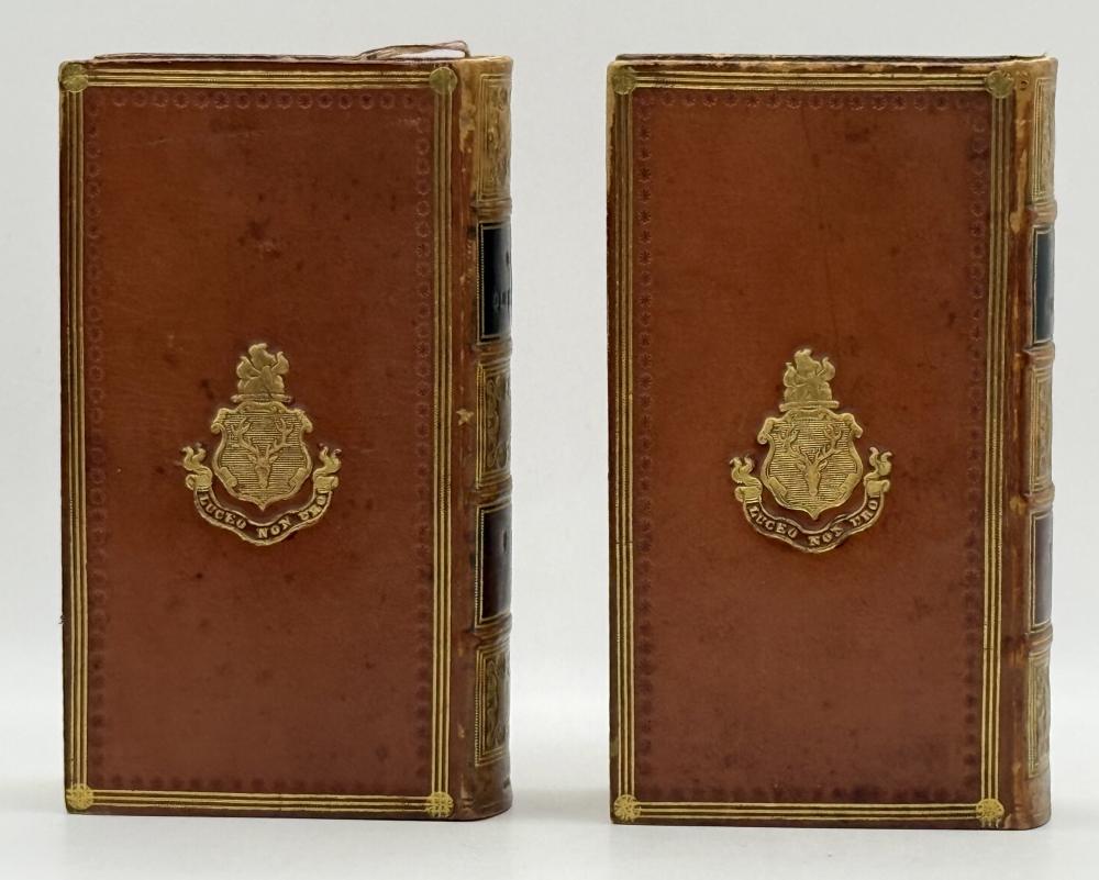 CGS0221 ![]() Click image to enlarge ![]() ![]() ![]() ![]() ![]() ![]() ![]() ![]() ![]() ![]() The History and Adventures of the renowned Don Quixote from the Spanish of Miguel Cervantes Saavedra by T Smollett... in Two Volumes 1818. DESCRIPTION: London, printed for J walker, 2 Volumes, 16mo, Pagination xxiv, 563 (1); xi (1), 598. With an engraved frontis piece and an engraved vignette title to each volume. Bound in contemporary tanned calf, all edges gilt, spine gilt decorated within compartments and raised with double black / brown lettering and numbering pieces. Sides with triple gilt fillet borders and central heraldic badge with stag 'LUCEO NON URO' (Earls of Cromartie). The coat of arms still appears on the Dalmore whisky bottle. Binders ticket of Ogle and Son of Glasgow. SIZE: 130 x 70mm CONDITION: Lightly rubbed and faded to the spine however a very good clean set. £160.00 Have a Question?You need to be Signed In to ask questions. |
