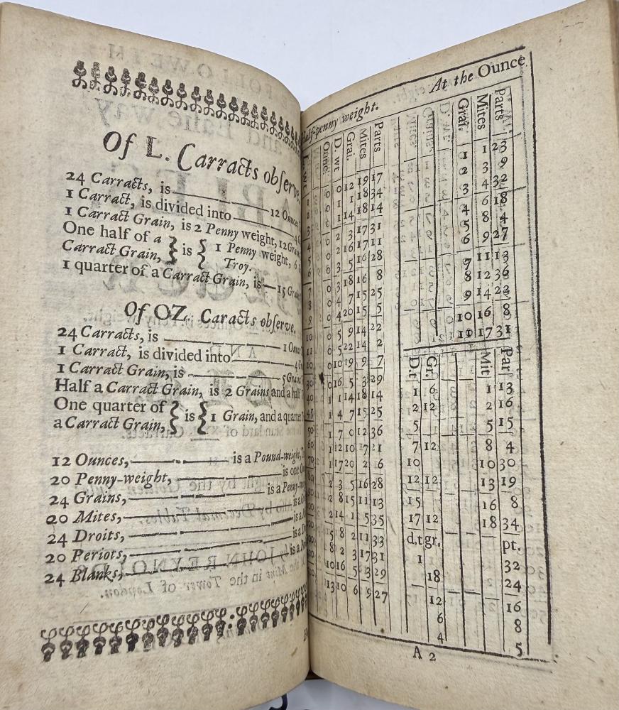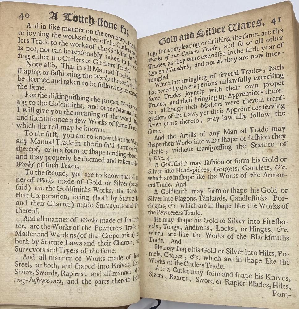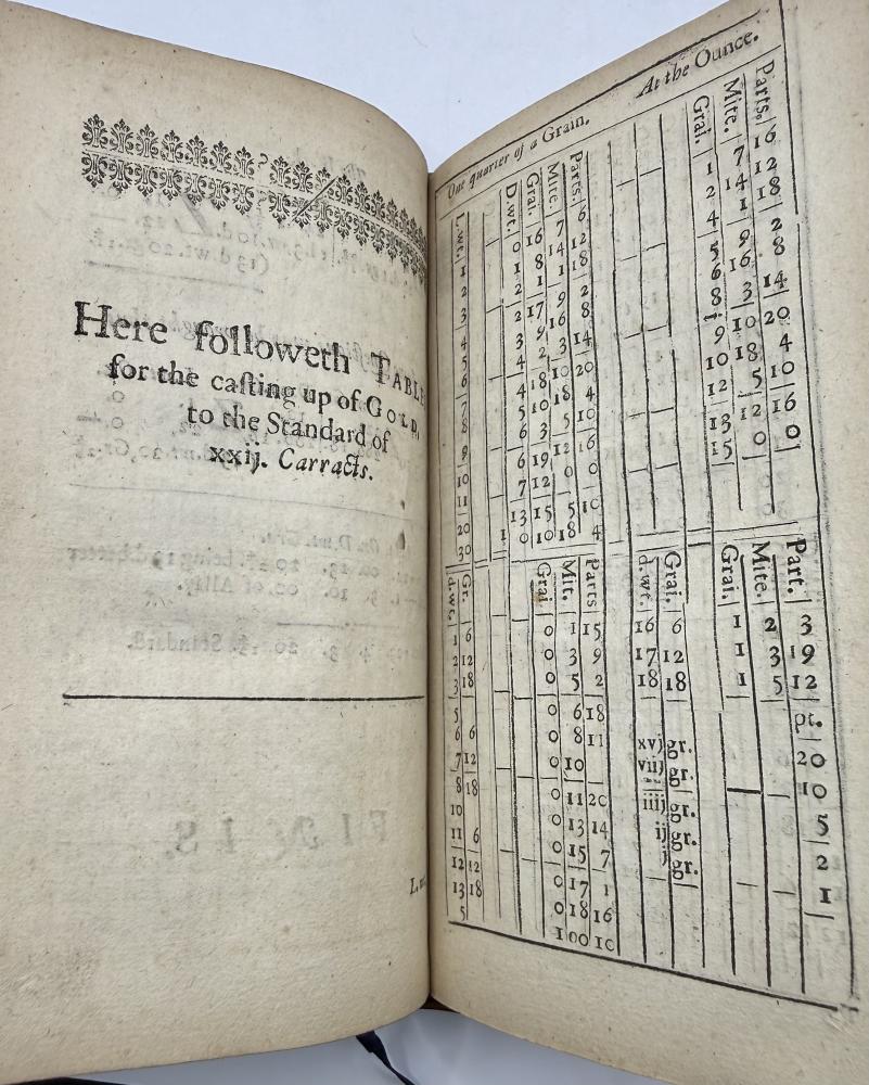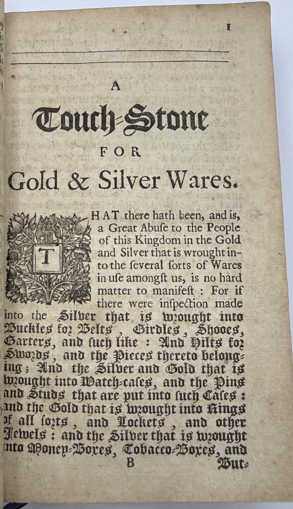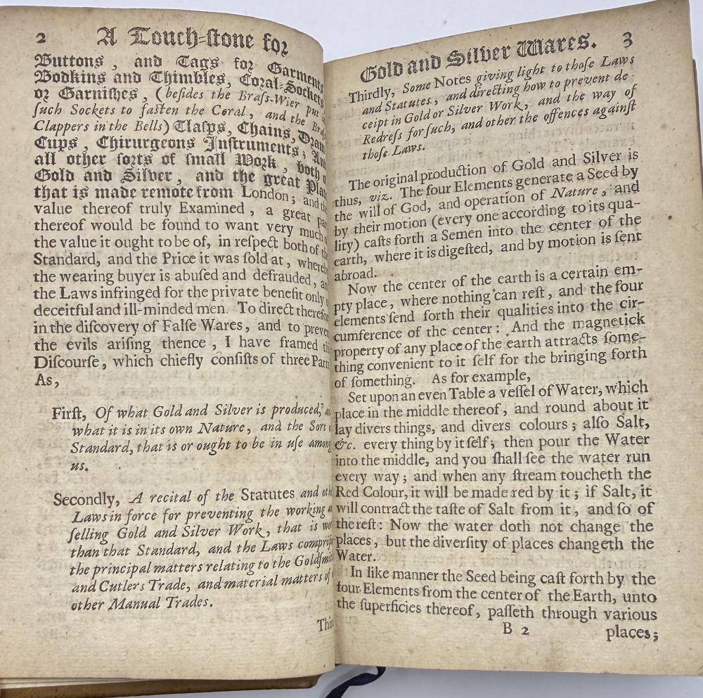 CGS0228 ![]() Click image to enlarge ![]() ![]() ![]() ![]() ![]() ![]() ![]() ![]() ![]() ![]() ![]() ![]() ![]() ![]() ![]() ![]() ![]() ![]() ![]() ![]() ![]() A new touch-stone for gold and silver wares. Directing all buyers of large plate, or small works, (as silver or gold hilts, buckles, watch-cases, pins and studs in watch-cases, money-boxes, tobacco-boxes, bells and sockets for corals, buttons and tags for garments, chirurgeons-instruments, rings, chains, lockets, or other goldsmiths works) how to know whether they buy or wear such as are of the lawful standard-allay, or adulterated and unlawful; and how to recover recompence against the offenders. And also discovering the principal matters of the goldsmiths and cutlers (and material things of all other manual) trades. The second edition, corrected and much enlarged, by W.B. of London, goldsmith. To which is likewise added, the useful and easie tables of Mr. John Reynolds, of the mint, (with a key to the same) plainly shewing how to cast up and make all sorts of gold and silver true standard. DESCRIPTION: London : printed for J. Bellinger in Cliffords-Inn-lane, and T. Basset at the George near Cliffords-Inn-gate in Fleetstreet, 1679. SIZE: 170 x 105mm CONDITION: Frontispiece is slightly chipped at corners and blank edges. Title page slightly soiled with the original date erased and added in ink. Light soiling only to text and one minor ink stain to text. As described above, signature K comprising 3 leaves at the end in excellent early pen facsimile. £950.00 Have a Question?You need to be Signed In to ask questions. |