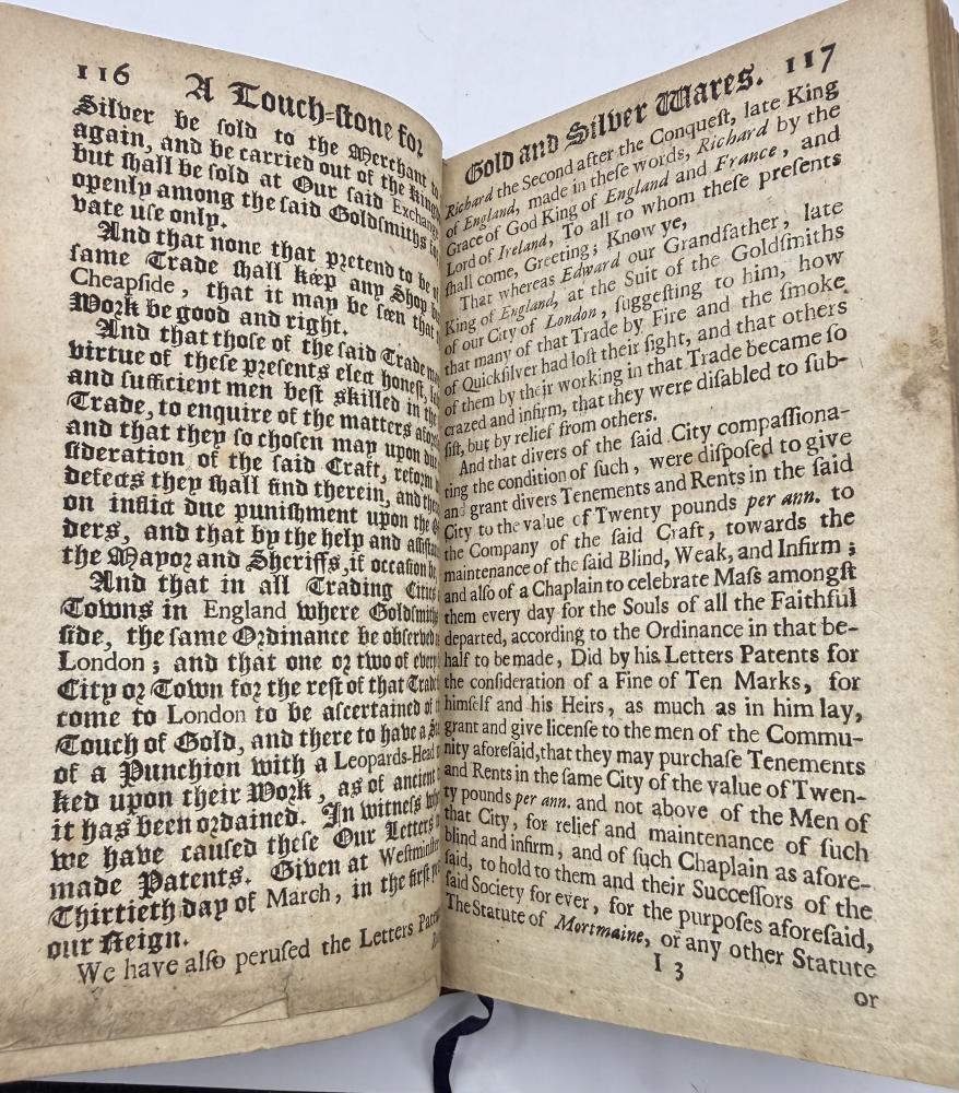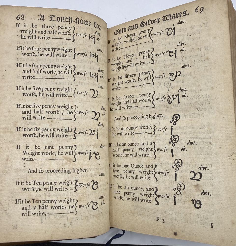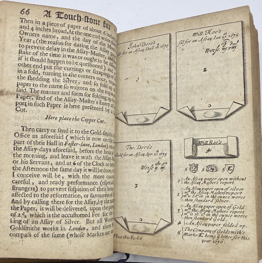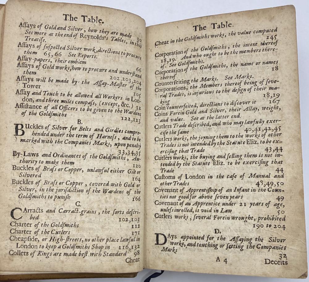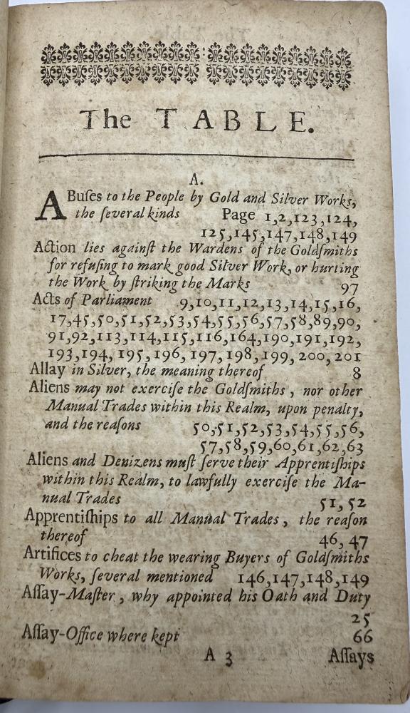 CGS0228 ![]() Click image to enlarge ![]() ![]() ![]() ![]() ![]() ![]() ![]() ![]() ![]() ![]() ![]() ![]() ![]() ![]() ![]() ![]() ![]() ![]() ![]() ![]() ![]() A new touch-stone for gold and silver wares. Directing all buyers of large plate, or small works, (as silver or gold hilts, buckles, watch-cases, pins and studs in watch-cases, money-boxes, tobacco-boxes, bells and sockets for corals, buttons and tags for garments, chirurgeons-instruments, rings, chains, lockets, or other goldsmiths works) how to know whether they buy or wear such as are of the lawful standard-allay, or adulterated and unlawful; and how to recover recompence against the offenders. And also discovering the principal matters of the goldsmiths and cutlers (and material things of all other manual) trades. The second edition, corrected and much enlarged, by W.B. of London, goldsmith. To which is likewise added, the useful and easie tables of Mr. John Reynolds, of the mint, (with a key to the same) plainly shewing how to cast up and make all sorts of gold and silver true standard. DESCRIPTION: London : printed for J. Bellinger in Cliffords-Inn-lane, and T. Basset at the George near Cliffords-Inn-gate in Fleetstreet, 1679. SIZE: 170 x 105mm CONDITION: Frontispiece is slightly chipped at corners and blank edges. Title page slightly soiled with the original date erased and added in ink. Light soiling only to text and one minor ink stain to text. As described above, signature K comprising 3 leaves at the end in excellent early pen facsimile. £950.00 Have a Question?You need to be Signed In to ask questions. |