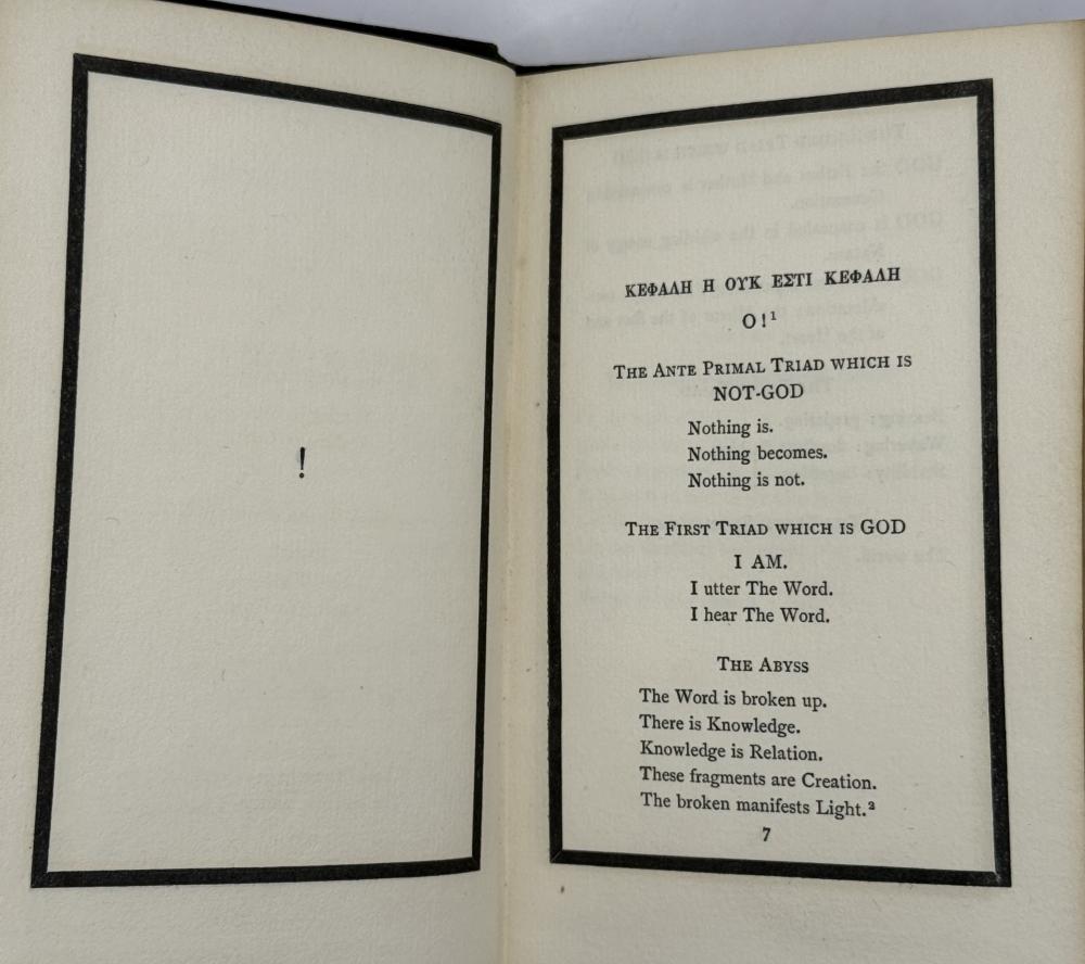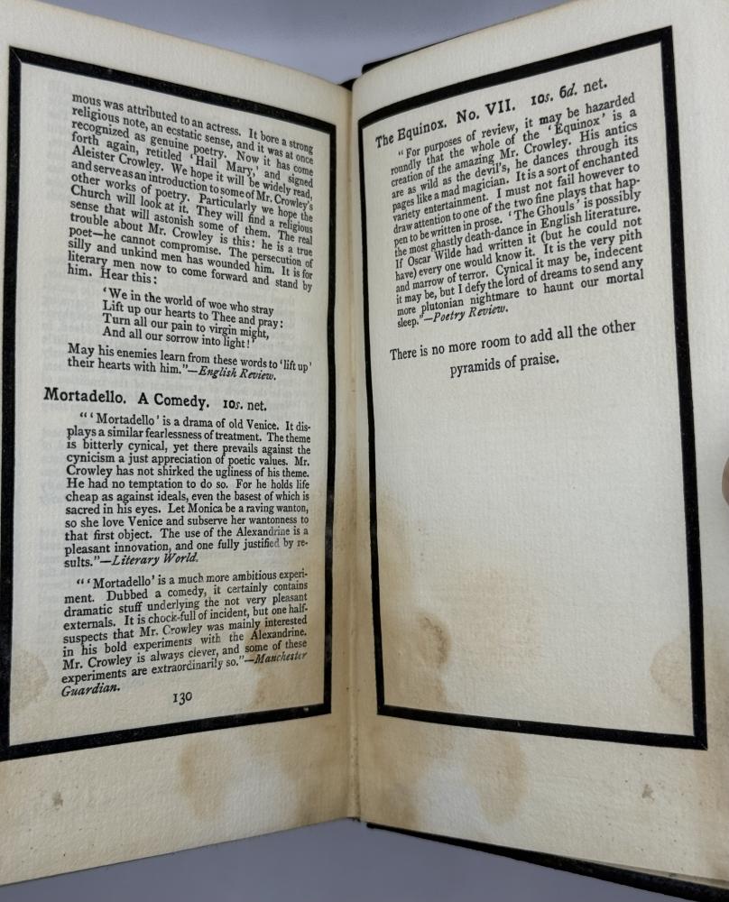 WPLJ0236 ![]() Click image to enlarge ![]() ![]() ![]() ![]() ![]() ![]() ![]() Liber CCCXXXIII The Book of Lies which is Also Falsely Called Breaks. The Wanderings or Falsifications of the one Thought of Frater Perdurabo Which Thought is Itself Untrue, London, Wieland and Co, South Kensington, 1913. DESCRIPTION: 16mo, 130,[2], text within black rule throughout, including 2 photographic plates with blank interleaves facing, errata slip facing page 61, bound in original dark greyish black buckram with ornate gilt design to upper board incorporating title and hieroglyphics to boards and lettering to spine. SIZE: 145 x 93cm CONDITION: Lower board and last two leaves lightly damp stained to inner margin slightly touching text but hardly serious. Minor rubbing else very good. £1450.00 Have a Question?You need to be Signed In to ask questions. |