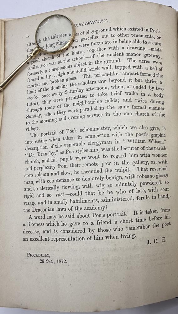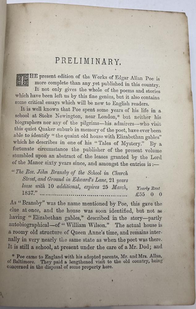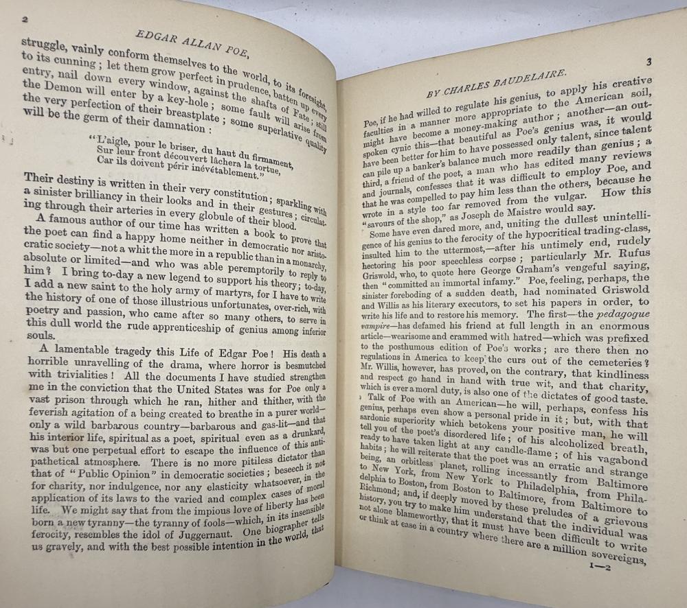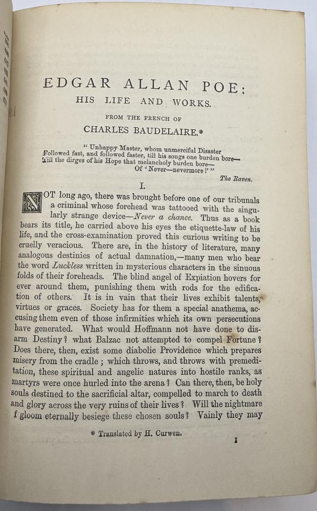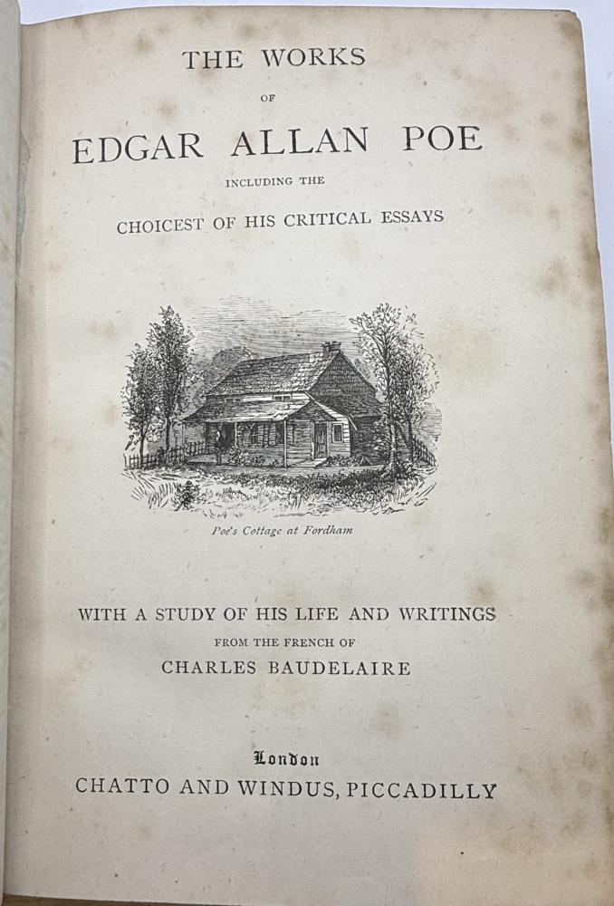 CGS0240 ![]() Click image to enlarge ![]() ![]() ![]() ![]() ![]() ![]() ![]() ![]() ![]() ![]() ![]() ![]() The Works of Edgar Allan Poe including the Choicest of His Critical Essays with a Study of His Life and Writings from the French of Charles Baudelaire, London, Chatto and Windus, circa 1873. DESCRIPTION: Octavo, pagination Viii, 544, with woodcut vignette to title page, portrait frontispiece and plate of facsimile handwriting. Bound in slightly later half turquoise blue crushed morocco with cloth sides, spine gilt within raised bands and marbled endpapers. SIZE: 188 x 120mm CONDITION: Internally with edge foxing effecting the frontispiece and facsimile plate as often otherwise generally clean. Old name to front blank, cloth infill of upper board lightly mottled or faded. Spine leather evenly faded however still a very good copy tight and sound. £325.00 Have a Question?You need to be Signed In to ask questions. |