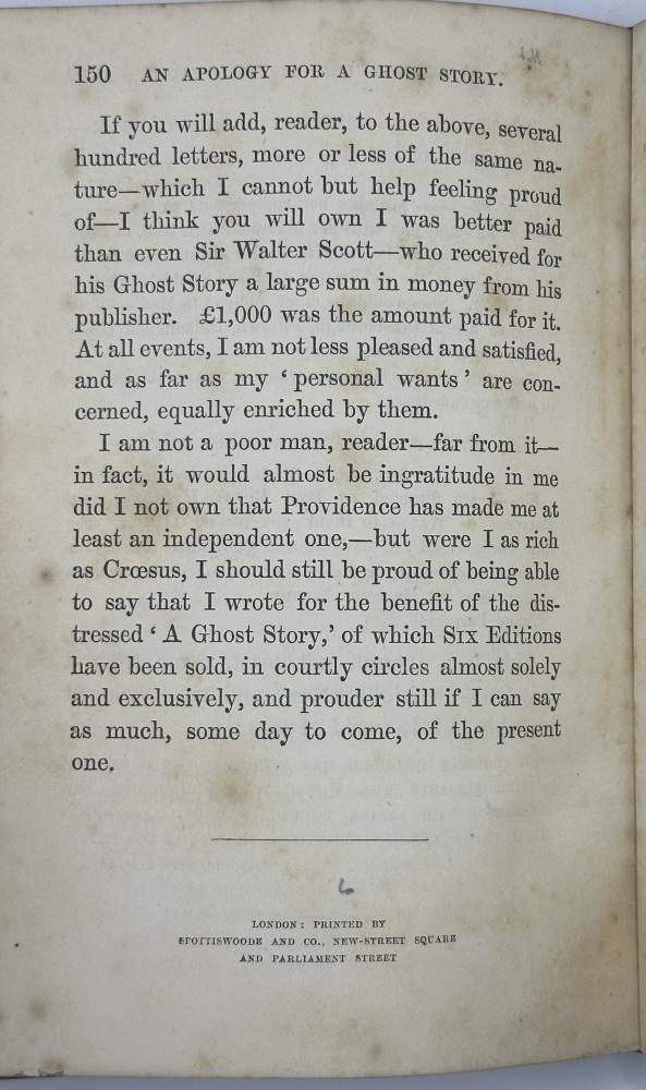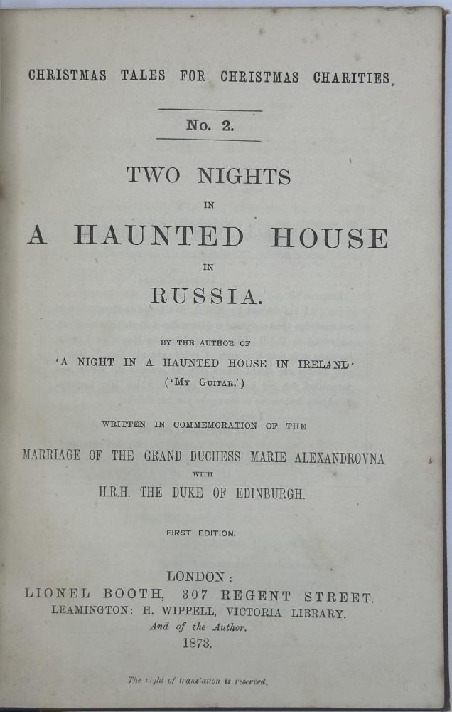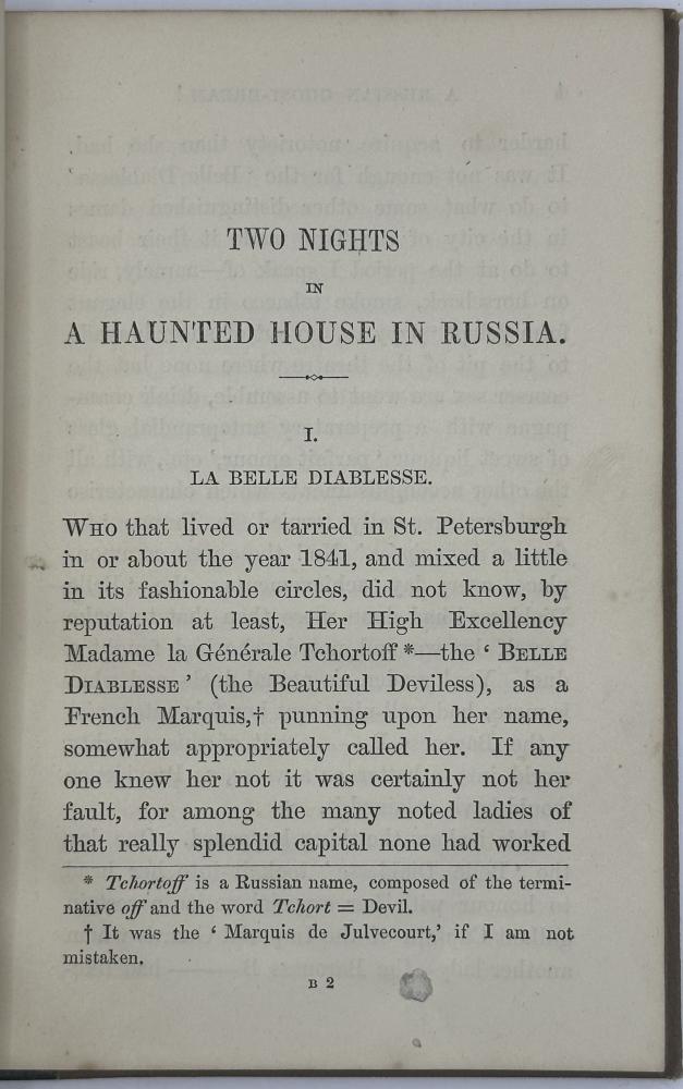 | Rare RUSSIAN GHOST STORY - Two Nights In a Haunted House 1873 1st Ed BKN0029 .jpeg) Click image to enlarge  .jpeg) .jpeg) .jpeg) .jpeg) .jpeg) .jpeg) .jpeg) .jpeg) .jpeg) Two nights in a haunted house in Russia, by the author of 'A night in a haunted house in Ireland'.[By Edward Tracy Turnerellli. DESCRIPTION: Published London, Lionel Booth, Regent Street, 1873. Two Nights in a Haunted House in Russia was no 2 of Trunerelli's 'Christmas Tales for Christmas Charities. It comprises 33 pages of preliminary matter, including advert page before the title detailing Turnerelli's charity fund raising from 1859 and the success of his first ghost story 'A Night in a Haunted House in Ireland' which has passed through 6 editions.  SIZE: 182 x 125mm. CONDITION: Blank endpapers lightly foxed. Contemporary name of 'Chloe Fielding', the binding lightly rubbed and other extremities, else a very good copy throughout. £600.00 Have a Question?You need to be Signed In to ask questions. |