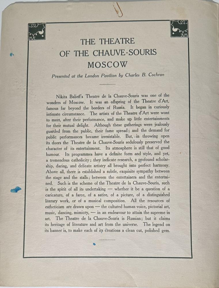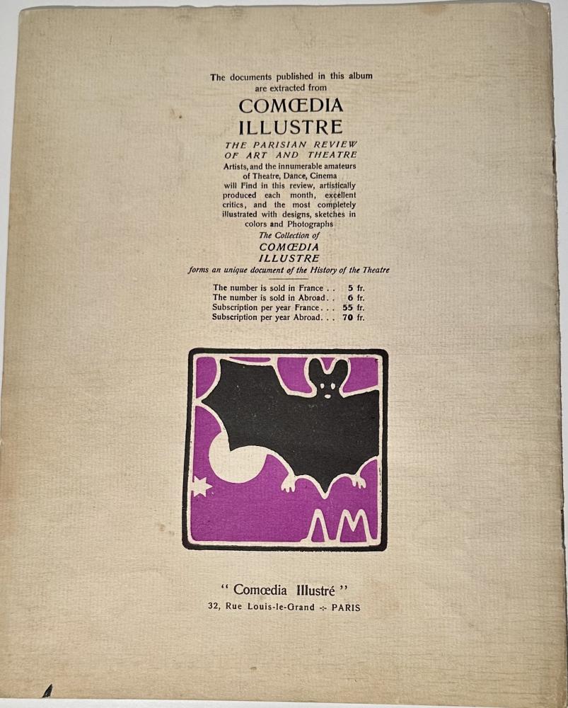 CGS0082 ![]() Click image to enlarge ![]() ![]() ![]() ![]() ![]() ![]() ![]() ![]() ![]() ![]() Theatre de La Chauve-Souris: The BAT theatre Moscow. London Pavilion Under the direction of Charles B Cochran. DESCRIPTION: 16 pages original stiff wrappers in stapled binding. The front cover with pochoir by Sudeikin / Soudeikine and lettering signature on the lower right corner. 11 small illustrations by S. Sudeikin and 12 small illustrations by N. Remisov. Published Comoedia Illustre, Paris, [1921]. SIZE: 12.6 x 9.6 inches CONDITION: Few letters/ numbers drawn in ink at the top left, upper margins contain minor margin dents caused by paper clip - visible internally to first couple of pages. Minor chip to the margin at the top right. one inch tear at the bottom. £185.00 Have a Question?You need to be Signed In to ask questions. |